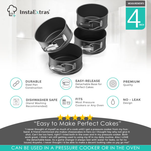 This set includes 4 springform cake pans measuring approximately 4″ in diameter. Each pan features a detachable base for easy removal of cakes.
